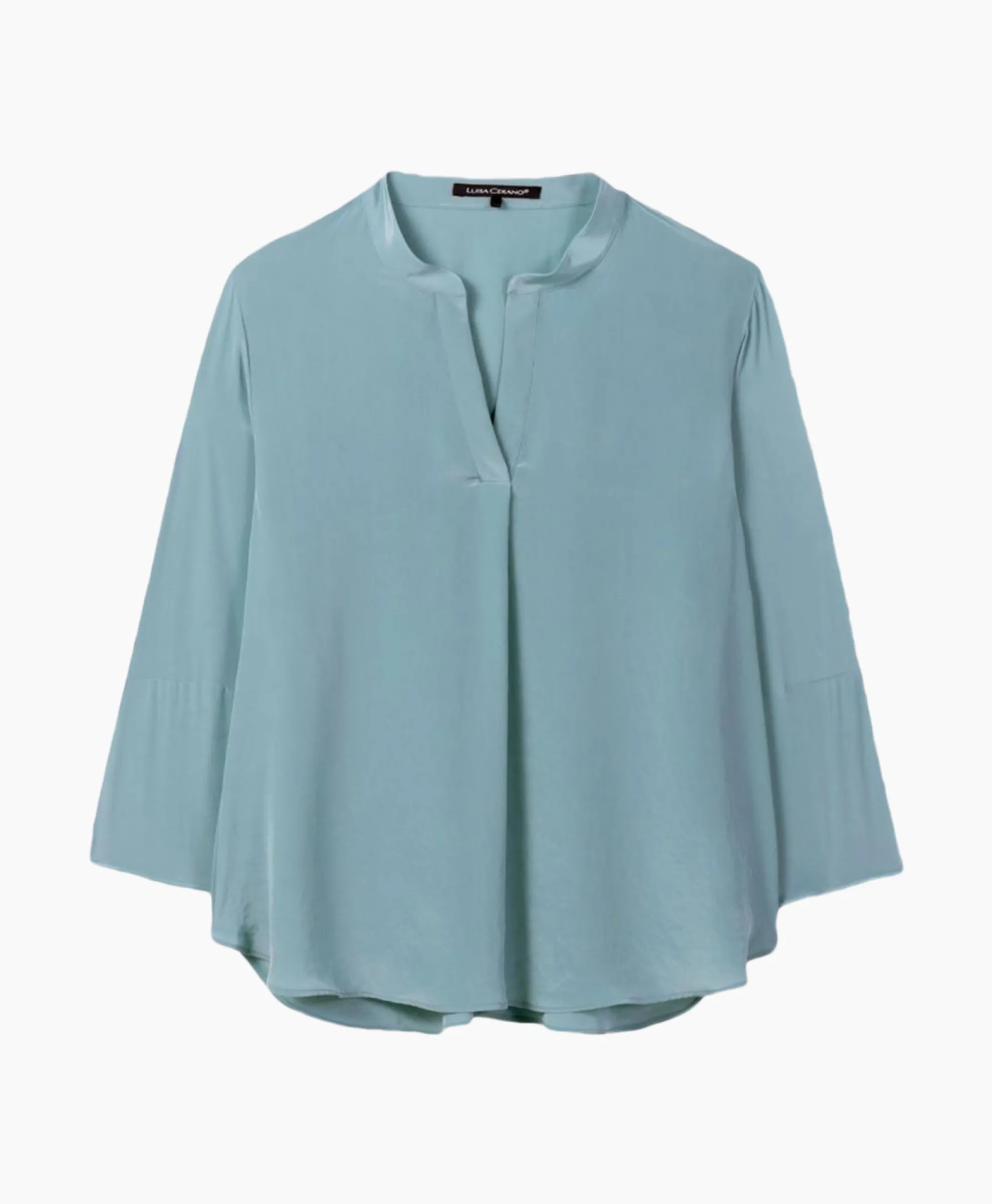 Tuniek Van Zachte, Vloeiende Techno Zijde. Deze Dunne Top Heeft Een Slanke Opstaande Kraag En V-Halslijn En Wijde Mouwen Die ¾ Lang Zijn. Ons Model Is 178 Cm Lang En Draagt Maat 36. Materiaal: 100% Polyester.