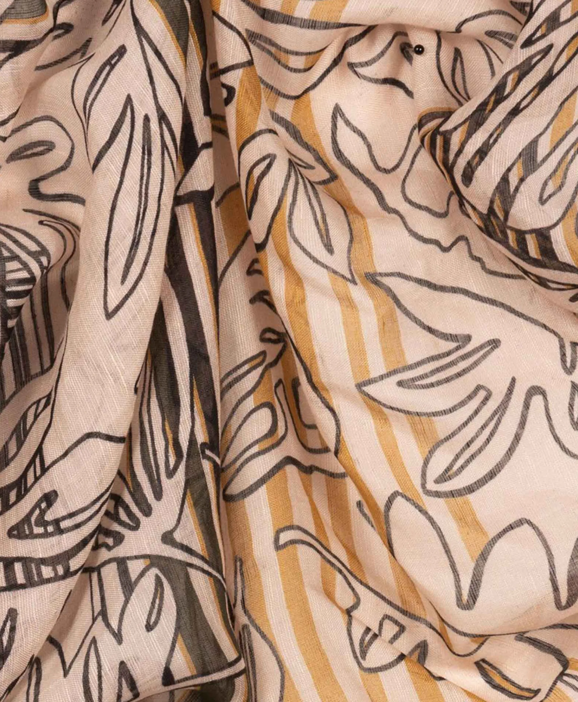 Driehoekige Sjaal Met Zijdegehalte En Een Bladprint. Eén Rand Is Open En Afgewerkt Met Fijne Franjes.&Nbsp;